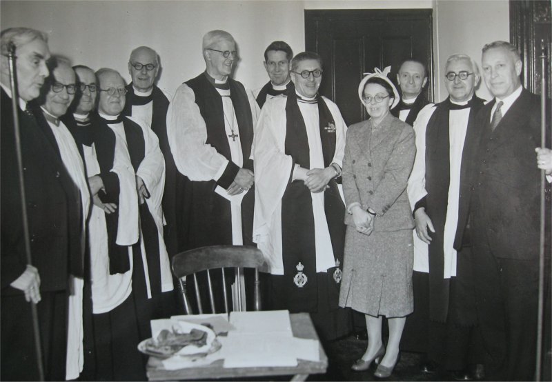 This photograph above was taken at the induction of the Rev. Mervyn Candy at St. Nicholas, Hardenuish on the 7th November 1955. The Churchwardens are Mr. W. Gool Slade (on the left) and Mr. S.W.H. Dann (on the right). Stood on Mervyn's right is the Bishop, the Rt Rev. Charles Saunders; stood on Mervyn's left is Miss Christian, patron. The Archdeacon of Swindon, the Ven. Leonard Cornwell is standing next to Mr. Dann. Standing at the back between the Bishop and the Rev. Canby is Rev. Brocklebank. |